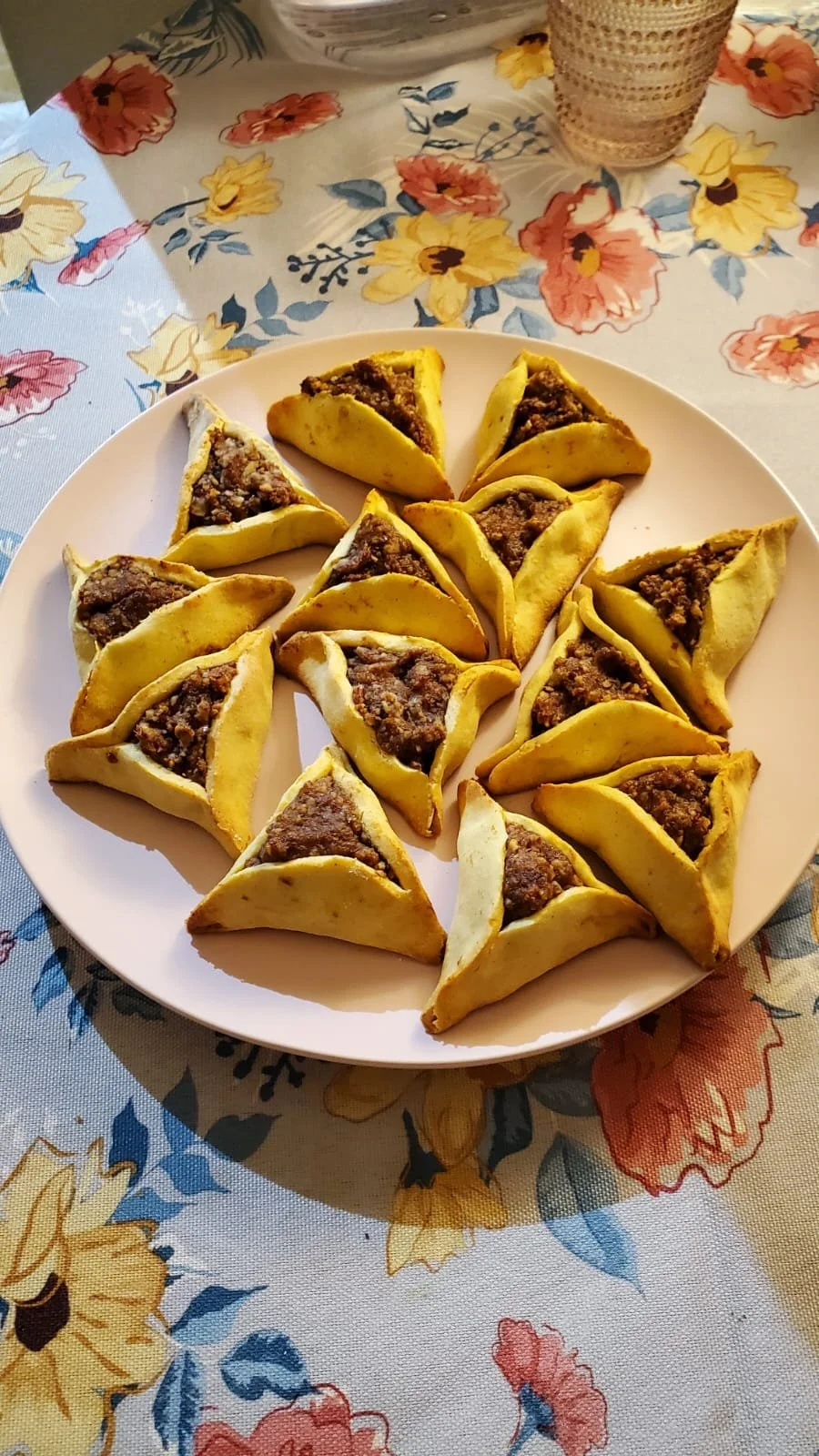 Spoon a teaspoon of date filling in the middle of each circle. Fold into a triangle: fold the left side on an angle, followed by the right side, and then the button, forming a triangle-shaped picket. Pinch the seams firmly. Repeat with remaining dough.
